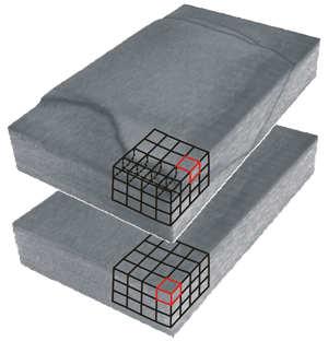 Abb. 1: experimenteller Scan eines Referenzzustandes (unten) und des deformierten (oben) Zustandes, illustriert durch interrogative Sub-Volumina