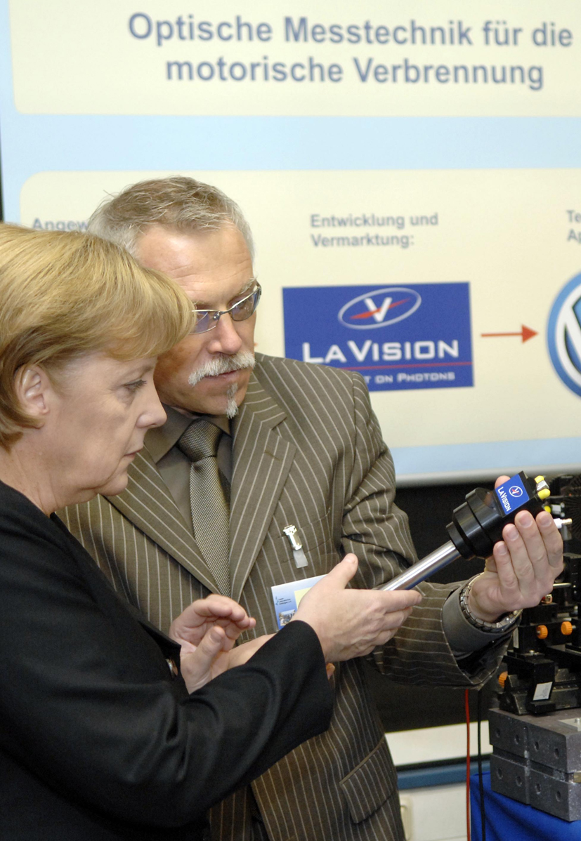 Mrs. Merkel made her PhD in physical chemistry and worked at the Academy of Sciences in Berlin on studies about fuel air mixture prior to her political career. She was impressed by LaVision's innovation made in optical diagnostics.