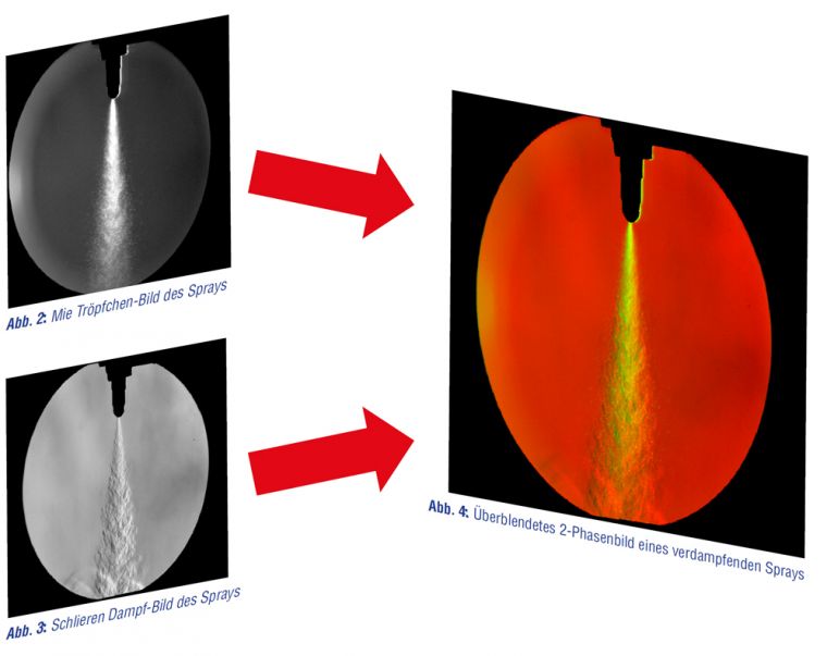 LaVision hat dafür ein robustes Imaging-System für die industrielle Anwendung konzipiert, das qualitative Informationen zu beiden Phasen liefert durch gleichzeitige Mie-Streubildaufnahmen der Tröpfchen und Schlieren-Aufnahmen der Dampfphase.