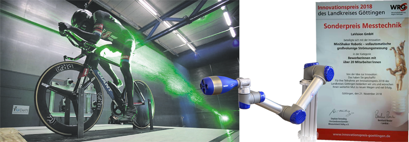 For LaVision one highlight of 2018 was the receipt of an innovation award for our 3D camera MiniShaker Aero Robotic. This robot-supported camera system with integrated light source permits fully automated and large-volume 3D flow field measurements. The system has already been successfully used to optimize the aerodynamic shape of a racing cyclist in a wind tunnel.