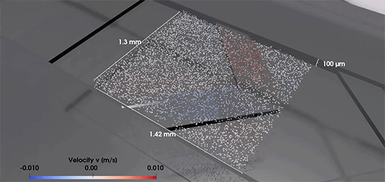 Il est même possible d’appliquer la nouvelle technique FlowMaster Shake-the-Box (PTV 4D) avec système stéréo microscopique. Ceci permet une approche de mesure réellement volumétrique 3D3C avec suivi temporel des trajectoires particules. On obtient ainsi des résultats précis à proximité des surfaces et des obstacles, là où la PIV peut introduire un biais indésirable.