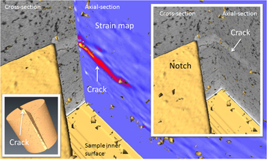 La figure présente une section d'une éprouvette fracturée selon un test de type "chevron-notch" dans un graphite nucléaire (20 mm de diamètre). Dans les résultats présentés, la DVC a été utilisée pour calculer la déformation et la contrainte entre l’image volumique de l’éprouvette dans son état de référence libre (non contraint), et l’image volumique dans son état de contrainte (incluant la fracture). Les données montrent qu’une fracture stable s’est propagée depuis l’extrémité de la pointe du chevron
