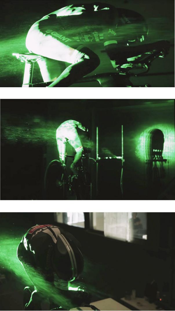 The Giant-Alpecin professional cycling team tested various helmets and suits with a 3D mannequin of one of its drivers in the wind tunnel of TU Delft. The aim was to check the aerodynamics of a brand-new skinsuit with the help of the Particle Image Velocimetry technique (PIV). The seeding particles needed for the PIV measurements were generated with LaVision's Helium-filled soap bubble generator. This device produces up to 2 Mio bubbles per second and is therefore very nicely suited for the seeding of large measurement volumes, like e.g. in wind tunnels. These large Helium-filled soap bubbles also have the advantage to be much brighter than smaller standard oil-aerosol seeding particles.