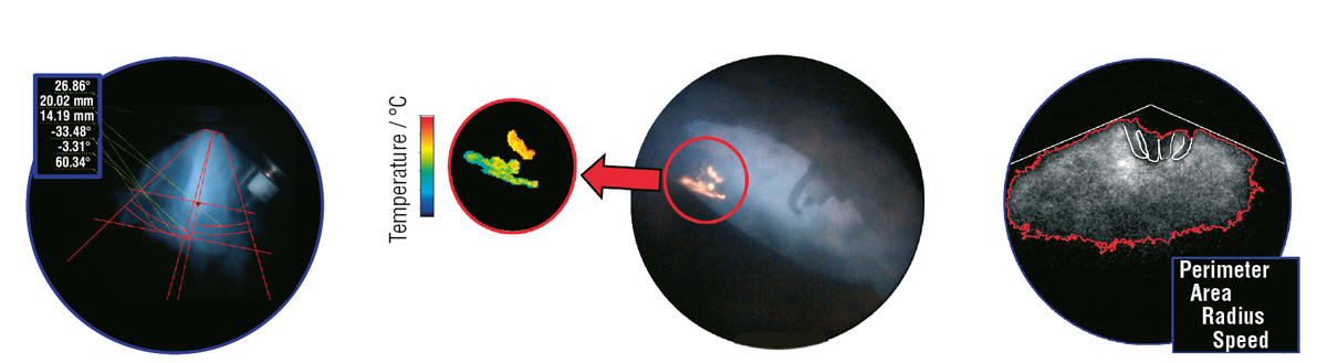 EngineMaster inspex n'offre pas seulement la visualisation dans les cylindres moteur. La mise en œuvre des puissants algorithmes de traitement du logiciel DaVis de LaVision permet d'extraire des informations quantitatives à partir d'images endoscopiques, telles que la géométrie de pulvérisation de carburant, la vitesse de propagation de la flamme ainsi que la température de suie.